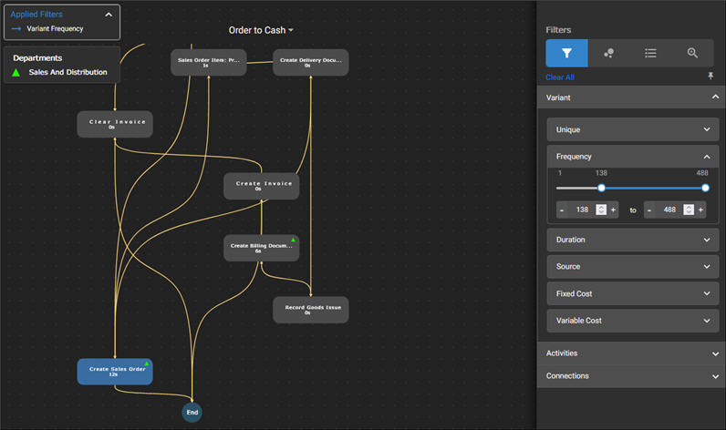 The Business Process Visualization screen opens with the most common variant shown at the highest frequency. If needed, filter variants before you highlight them. For more information, see Filtering Variants.