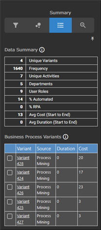 The Process Intelligence Variants panel allows you to view all of your variants in one place with the variant numbers. The variant number is a system generated ID, but it does not convey any meaningful information to the user.