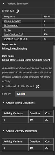 In the Business Process Variants table, click on a variant to open the Variant Summary panel. In the Activities Within This Variant section, the total number of different versions of the same activity is listed across all business processes.