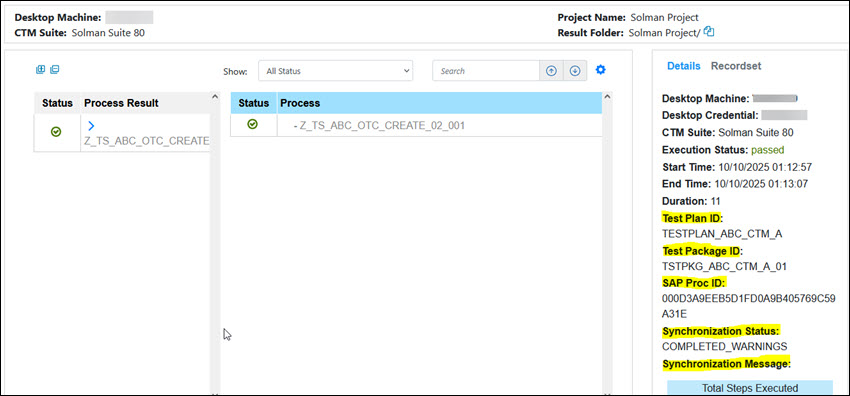 If you have integrated CTM with the SAP Solution Manager, the Details tab displays additional information in Worksoft Results UI.