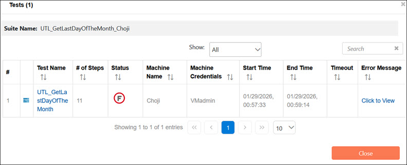 From the Tests dialog, you can access the Worksoft Results UI to view execution step result details. Click the Open Certify Results Viewer