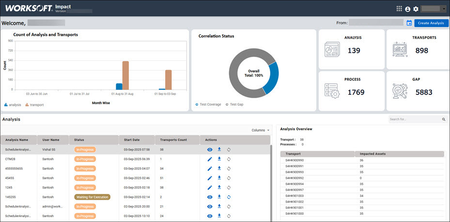 The Worksoft Impact dashboard provides a comprehensive view of your generated analyses, transports, and processes. The dashboard helps you plan and manage your automation test repository to ensure test coverage.