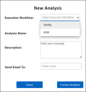 By default, both the Certify and ALM options are selected. When creating a new analysis, the Execution Workflow drop-down list displays both options in the New Analysis dialog.
