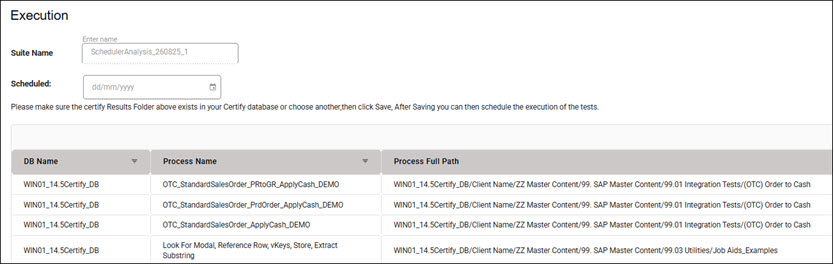 In the Execution tab, you can create and execute a Continuous Testing Manager (CTM) suite. This grid displays the Certify processes that will be executed in the suite.