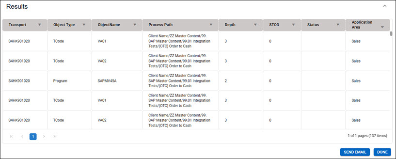 After the correlation is complete, the Test Coverage Gap tab opens, and SAP objects that lack test coverage in Certify processes are listed.